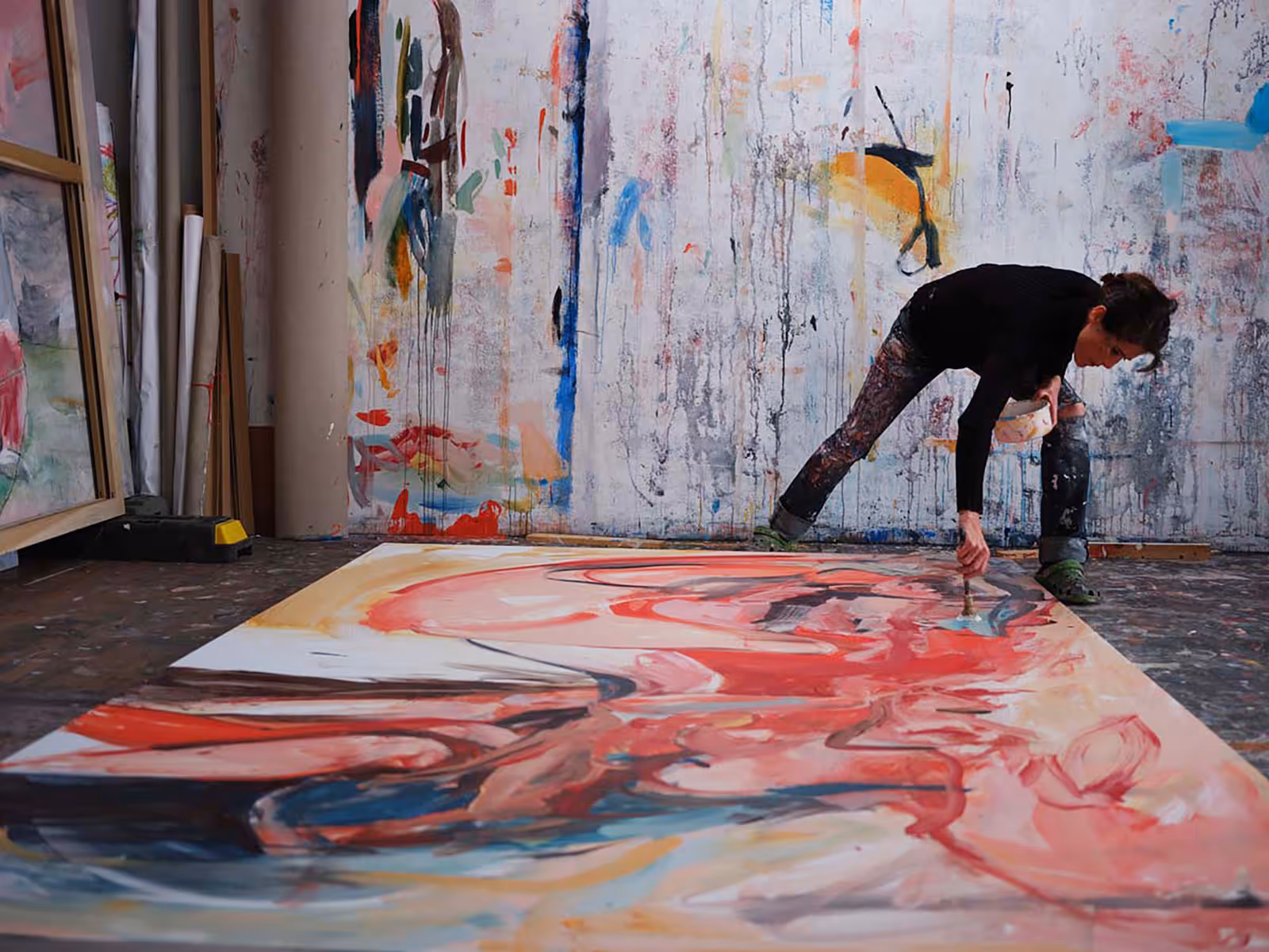 Mabel’s work is striking, large in scale and created in a way I’ve never seen before. She paints with music pumping through the studio, everything from Bowie and Blondie to Massive Attack and Muse. Her workflow moves to the rhythm of the music; she dances, moves and caresses the canvas in wide, deliberate strokes. Her paintings are abstract, yet within them there is a definite sense of form and emotion.