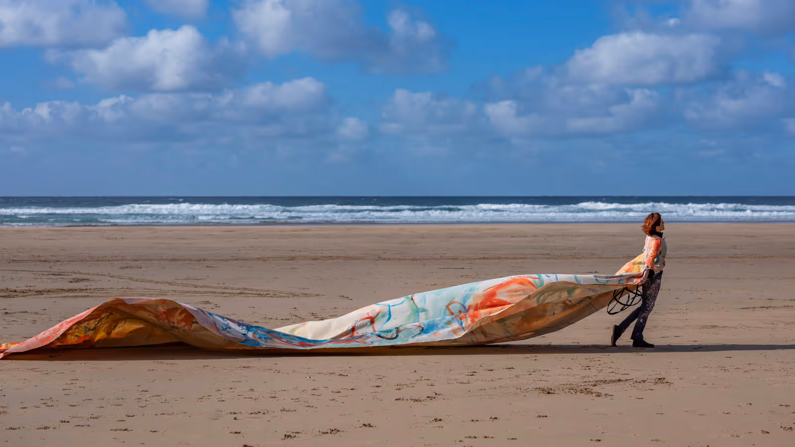 The installation began inside a cave at Perranporth Beach. Mabel climbed over boulders to reach the shoreline, dragging the long train of her coat behind her. She walked slowly into the strong wind that swept across the beach before suddenly tearing the coat from her shoulders.