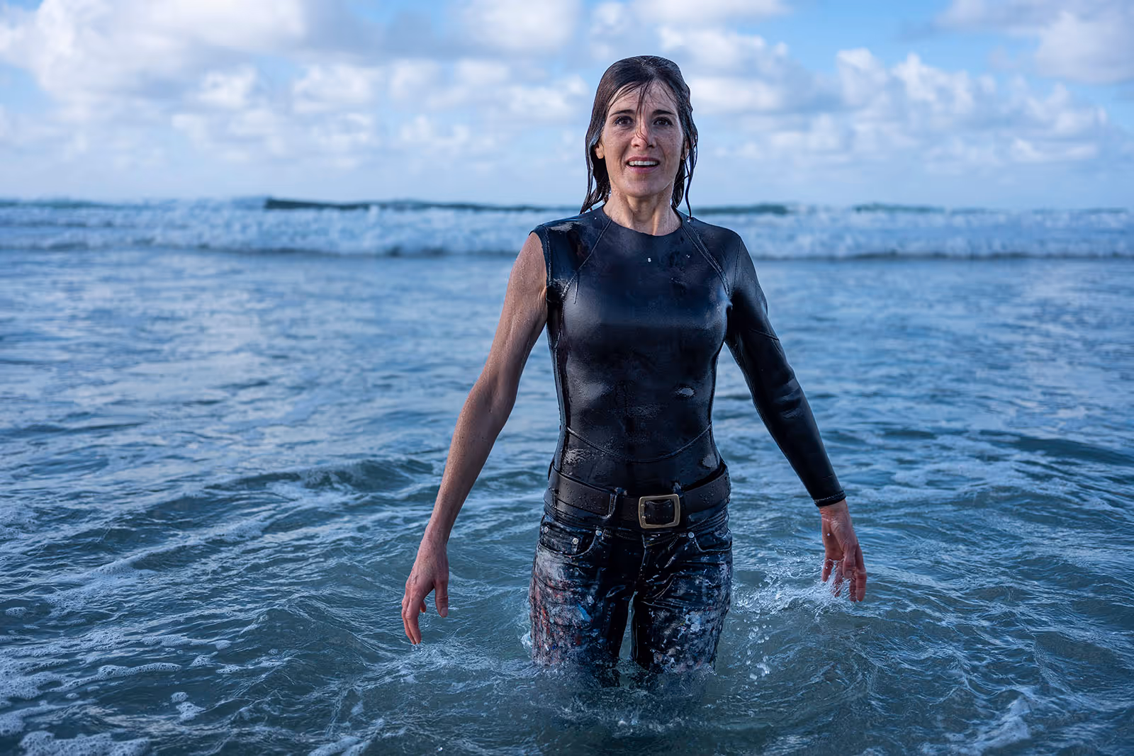 As she emerged, the sun broke through the clouds. Her hair and clothes were soaked, water dripping from her face, but she looked radiant, alive, almost reborn.